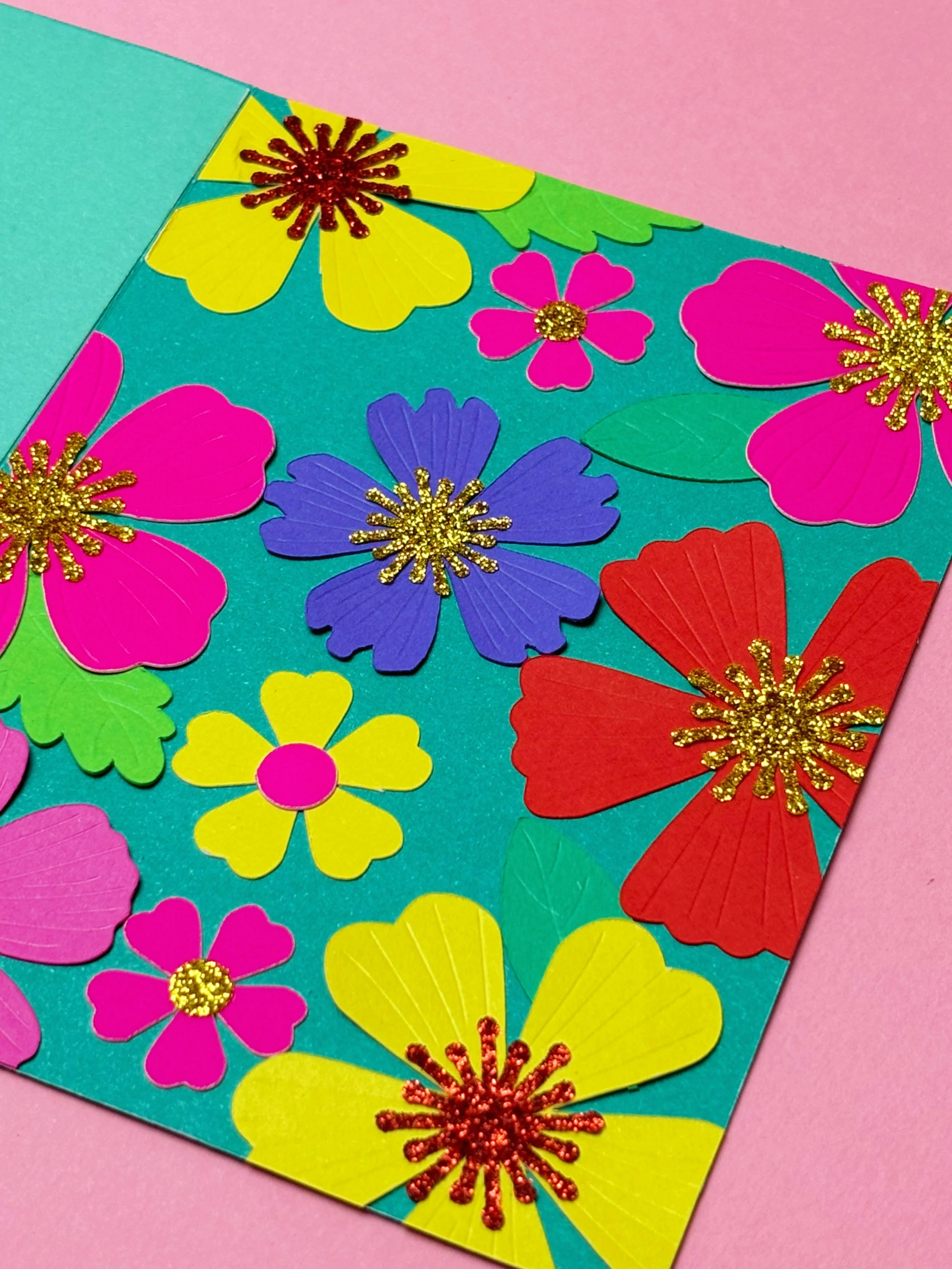 🌸 👉Vibrant multicolour cardstock and 👉Gold glitter vinyl for the flower centers (instant wow!)