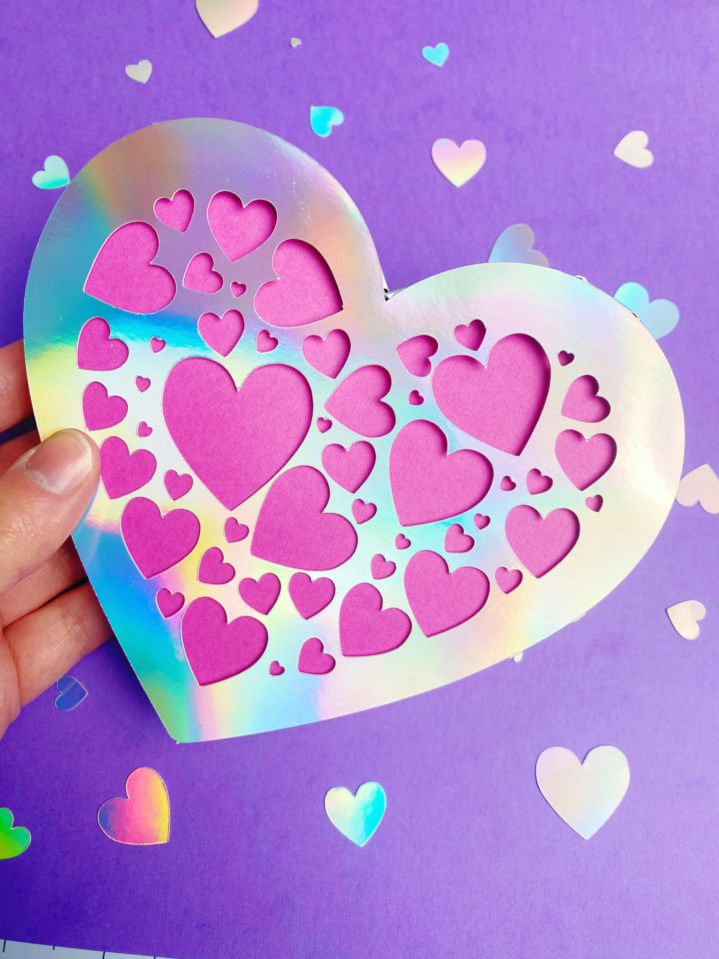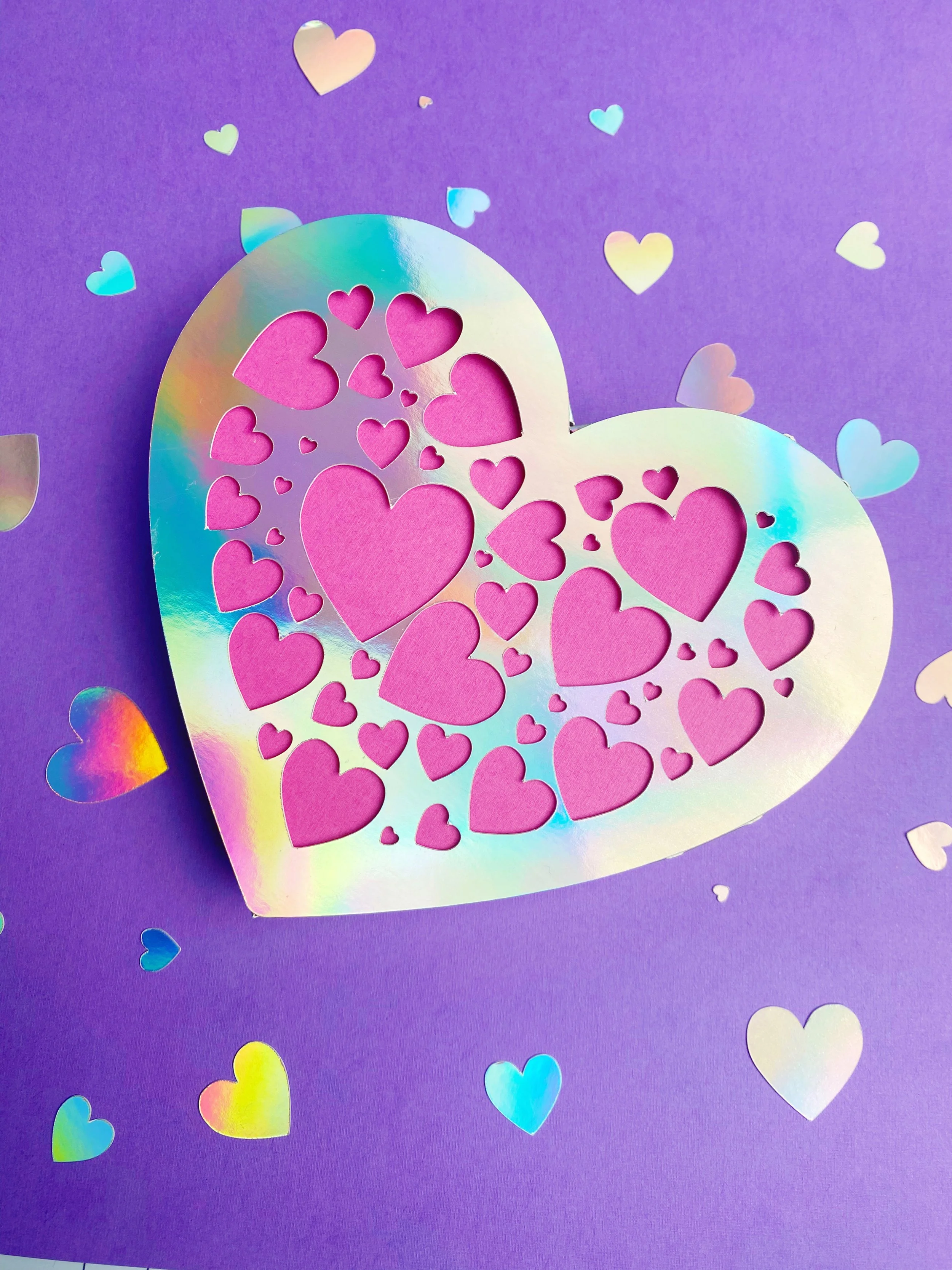 ❤️ Enchanting Heart Design – Featuring a shimmering iridescent heart with cut-out smaller hearts, adding a dreamy and romantic touch to your gift box. 💎 Perfect for Jewellery – Ideal for packaging bracelets, necklaces, or other delicate accessories for Valentine’s Day. 🎨 Customizable – Use your favourite colours, patterns, and embellishments to match your unique style or theme. 💡 Easy to Make – Simple to assemble, making it a great project for crafters of all skill levels.